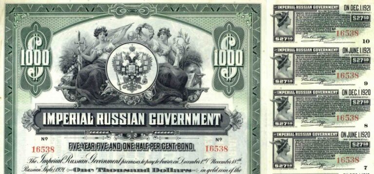 Carskie obligacje i lawfare przeciwko Rosji Dwadzieścia pięć milionów dolarów. Tyle wynosiła nominalna wartość obligacji, które w grudniu 1916 roku Cesarstwo Rosyjskie sprzedało amerykańskim inwestorom za pośrednictwem National City Bank of New York. Oprocentowanie: pięć i pół procent rocznie. Termin wykupu: pięć lat. Waluta: dolar amerykański, z klauzulą przeliczenia według parytetu złota obowiązującego w … Czytaj dalej Pozew o 225 miliardów dolarów – zamrożone aktywa rosyjskie jako cel funduszu sępiego